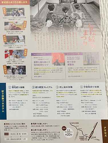 絞り製品の販売に加えて、「あるく」「つくる」「たべる」「まなぶ」「よそおう」と楽しみいっぱいのプログラムを予定しております。
